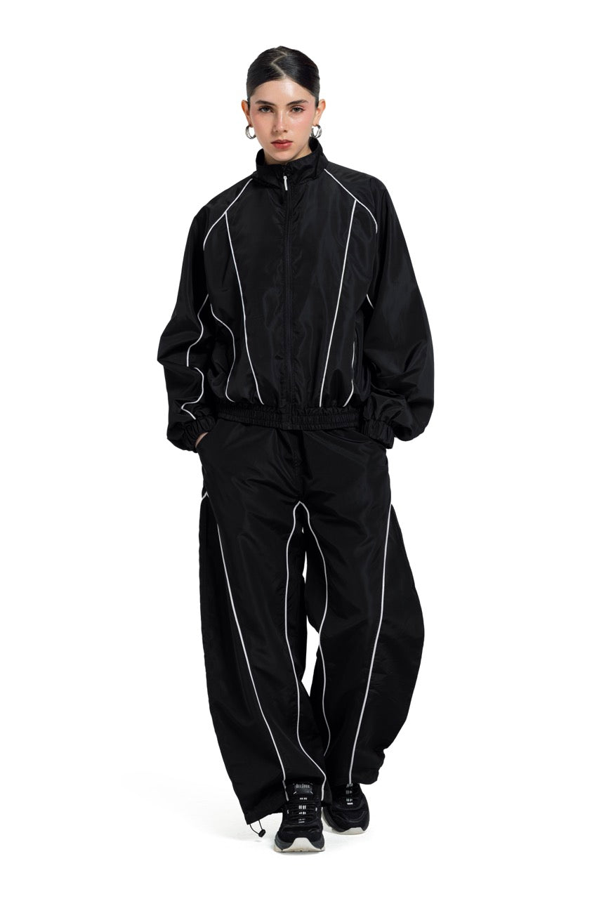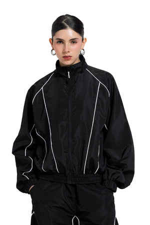 Unisex black track jacket with a relaxed fit, lightweight fabric, and contrast piping details. Features a front zip closure and elastic cuffs and hem for everyday comfort and a clean streetwear look.